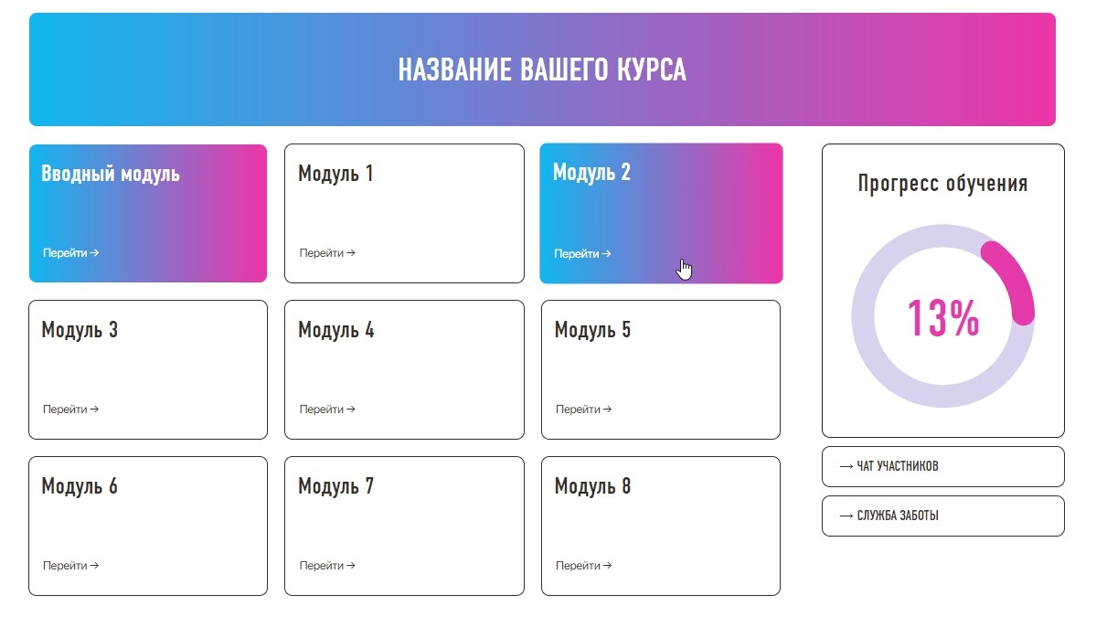 Этот вариант подойдёт, если вы хотите быстро и самостоятельно запустить курс и при этом обеспечить его приятный внешний вид. Да, придётся разобраться в настройках, но в целом они интуитивно понятны.